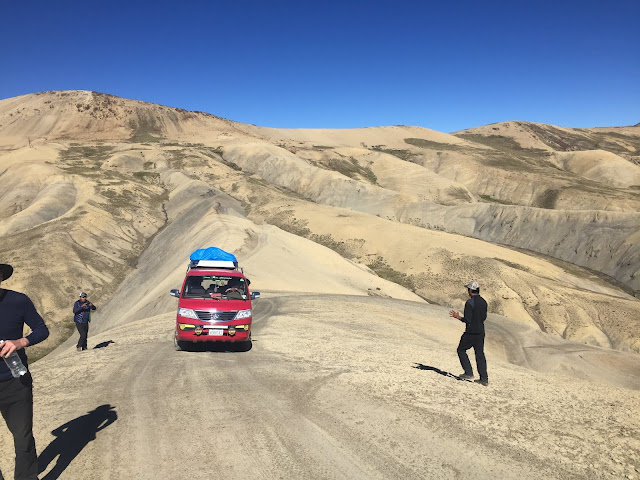 The 'road' (a term used very lightly) ran along eroding ridges with rather large sloping drops on either side. In the interest of passenger sanity and a tipping van, we had to get out regularly and walk. |